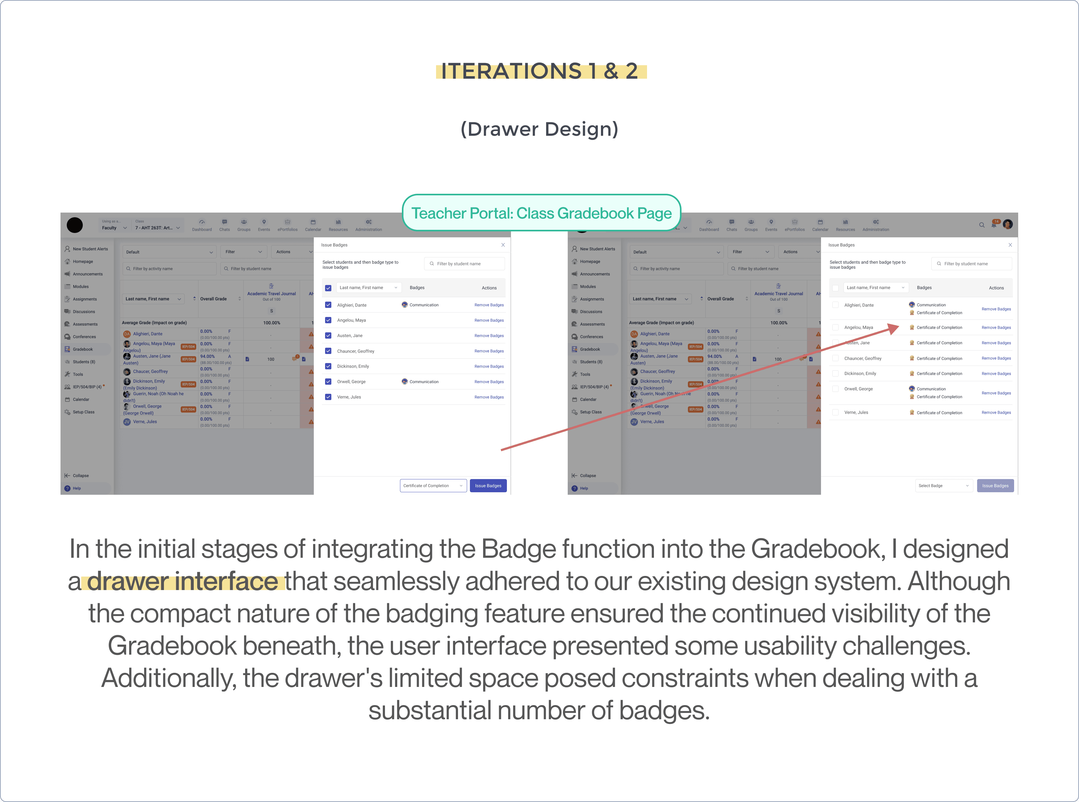 A pre-existing function enabling teachers to upload badge and certificate images had been implemented by our development team and was live in a separate tab of the class’s settings. While teachers had the ability to upload images, the function lacked usability as there was not yet a system to ‘award’ these to students on the class page. My responsibility was to design the remaining components of the feature, allowing teachers to manually award multiple or individual badges and certificates on the Teacher Portal. Additionally, I was tasked with designing a mechanism for students to view these awards on the Student Portal.