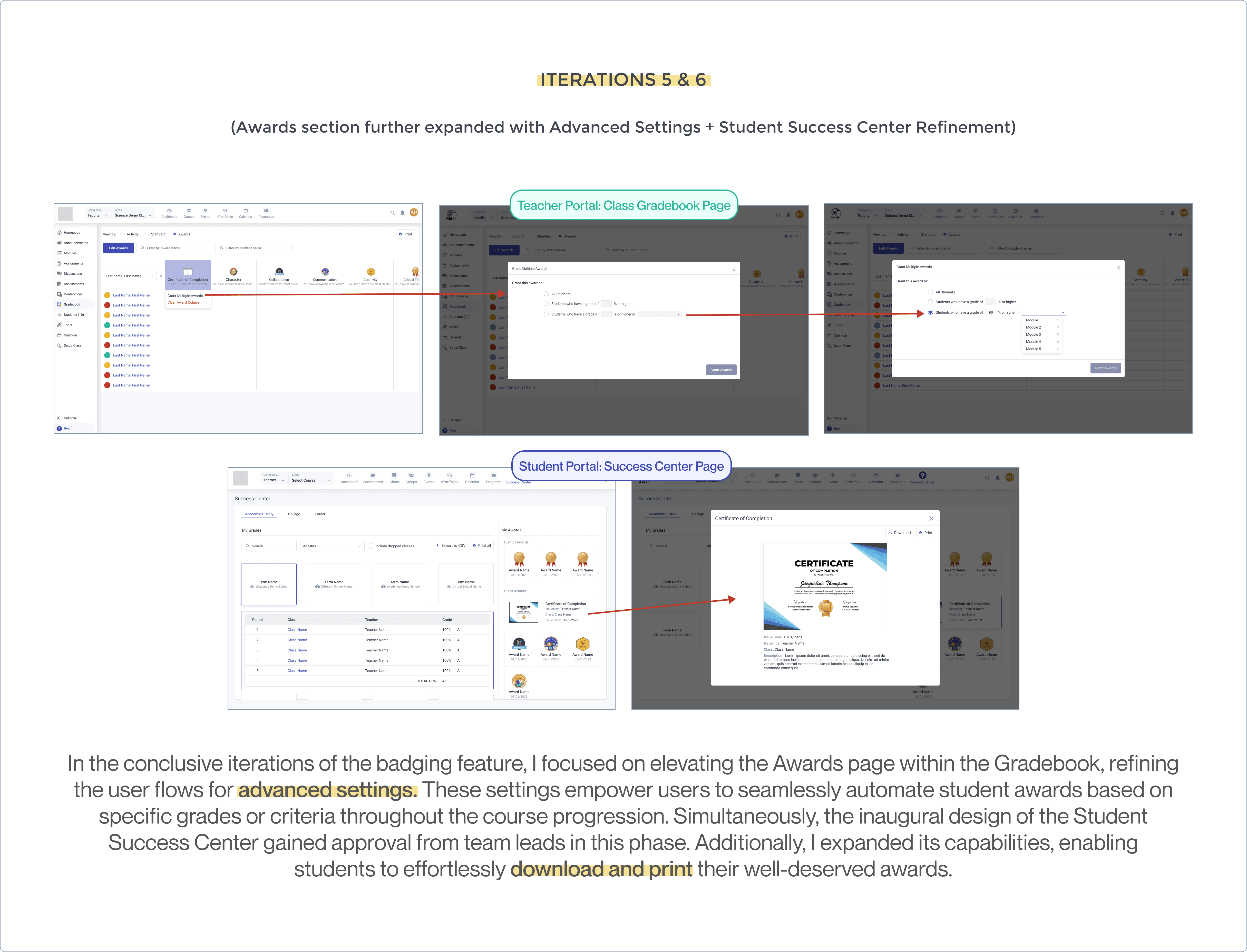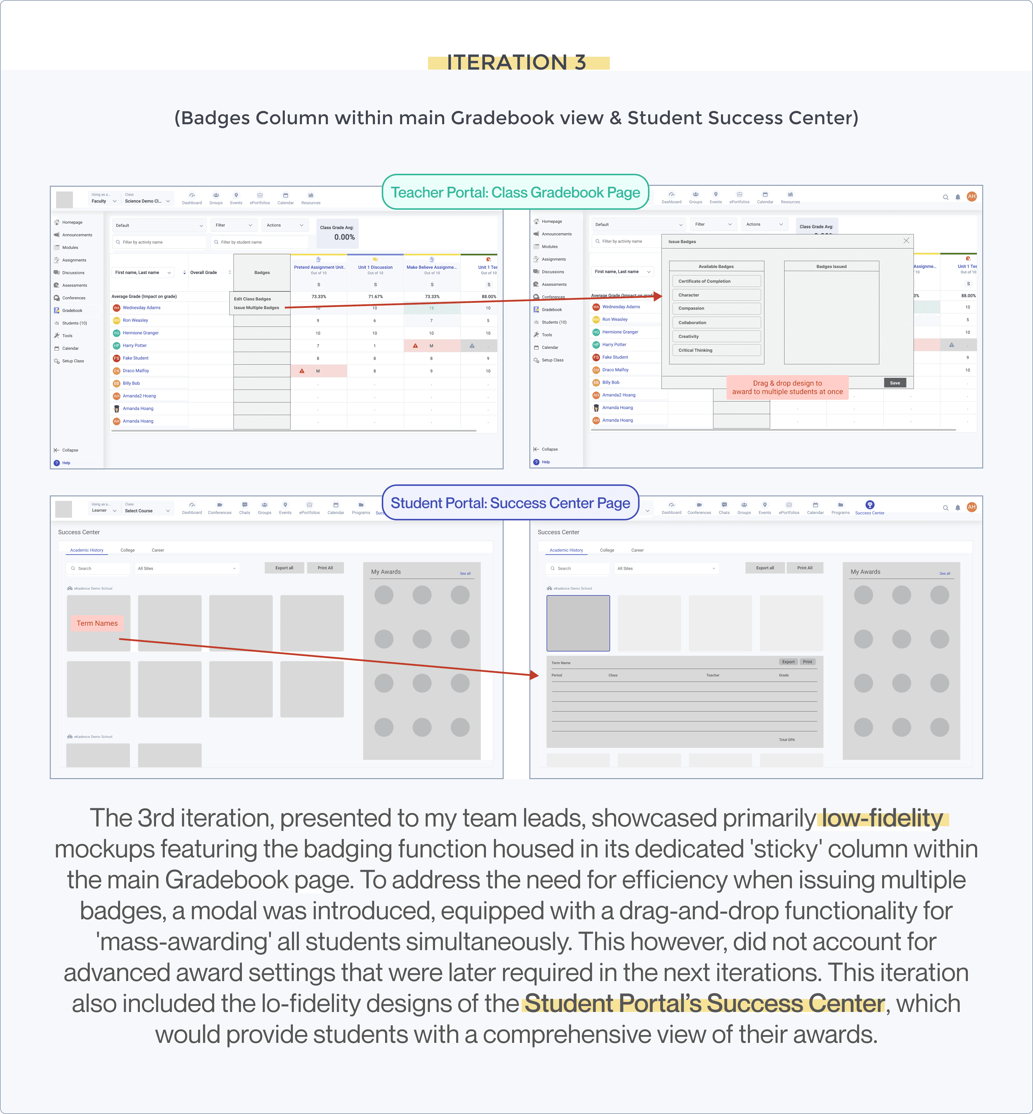 After six iterations at various fidelity stages, I strategically incorporated the new feature into our established classroom sitemap. Opting for placement in the Class Gradebook seemed ideal, as it allowed teachers to efficiently enter grades into the system, particularly for certificates and badges tied to academic achievements. Throughout the iterative process, I explored various interactions within my user flows to optimize the overall user experience.