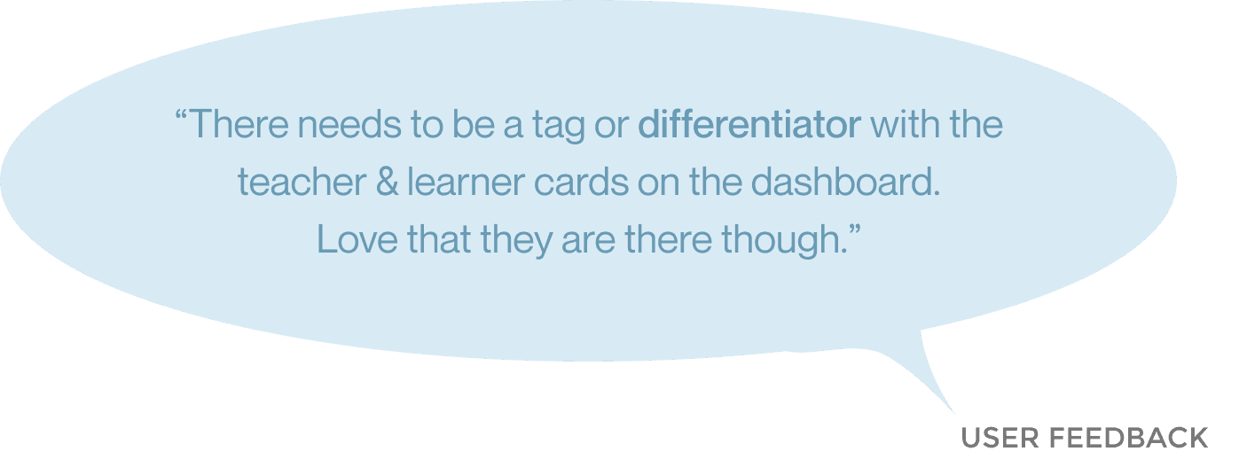 This adjustment aimed to address user feedback, as they expressed a preference for having both teacher and learner cards visible on a single dashboard rather than toggling between learner and teacher dashboards. However, additional challenges were identified through further user complaints: