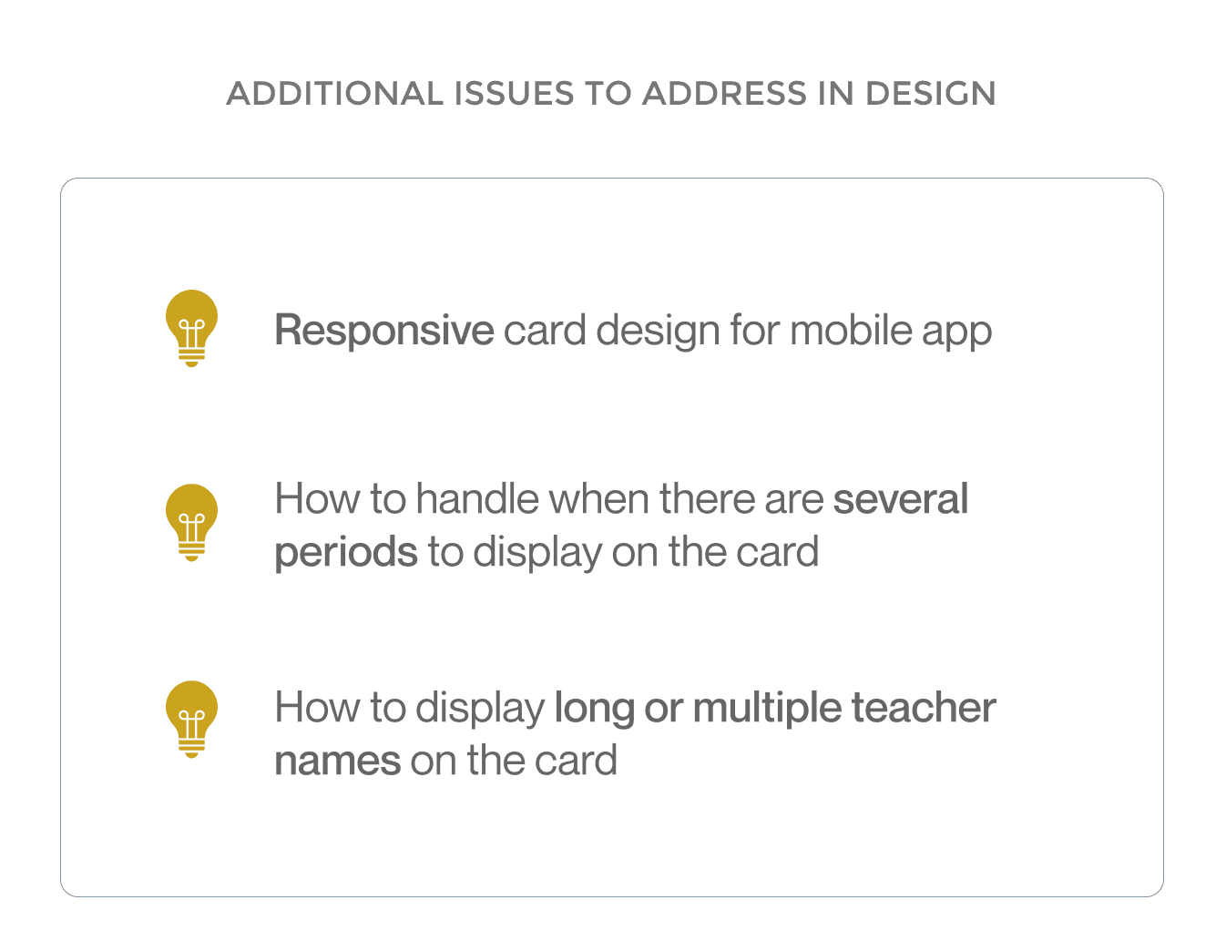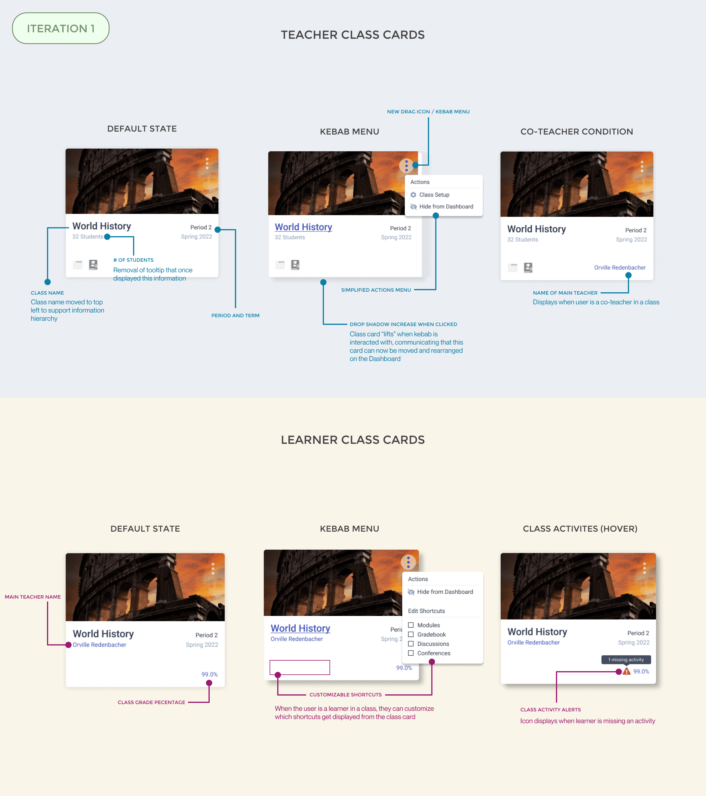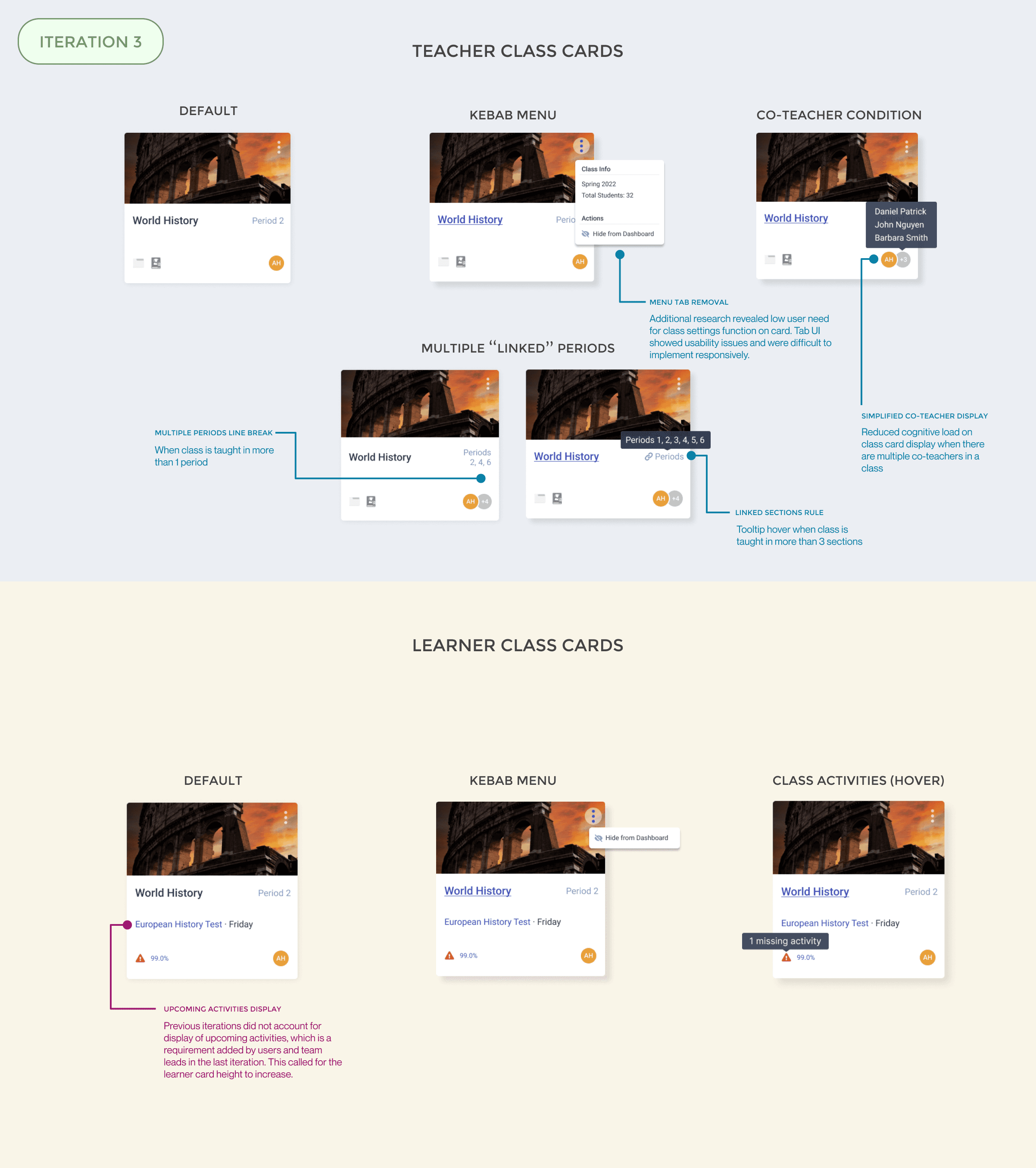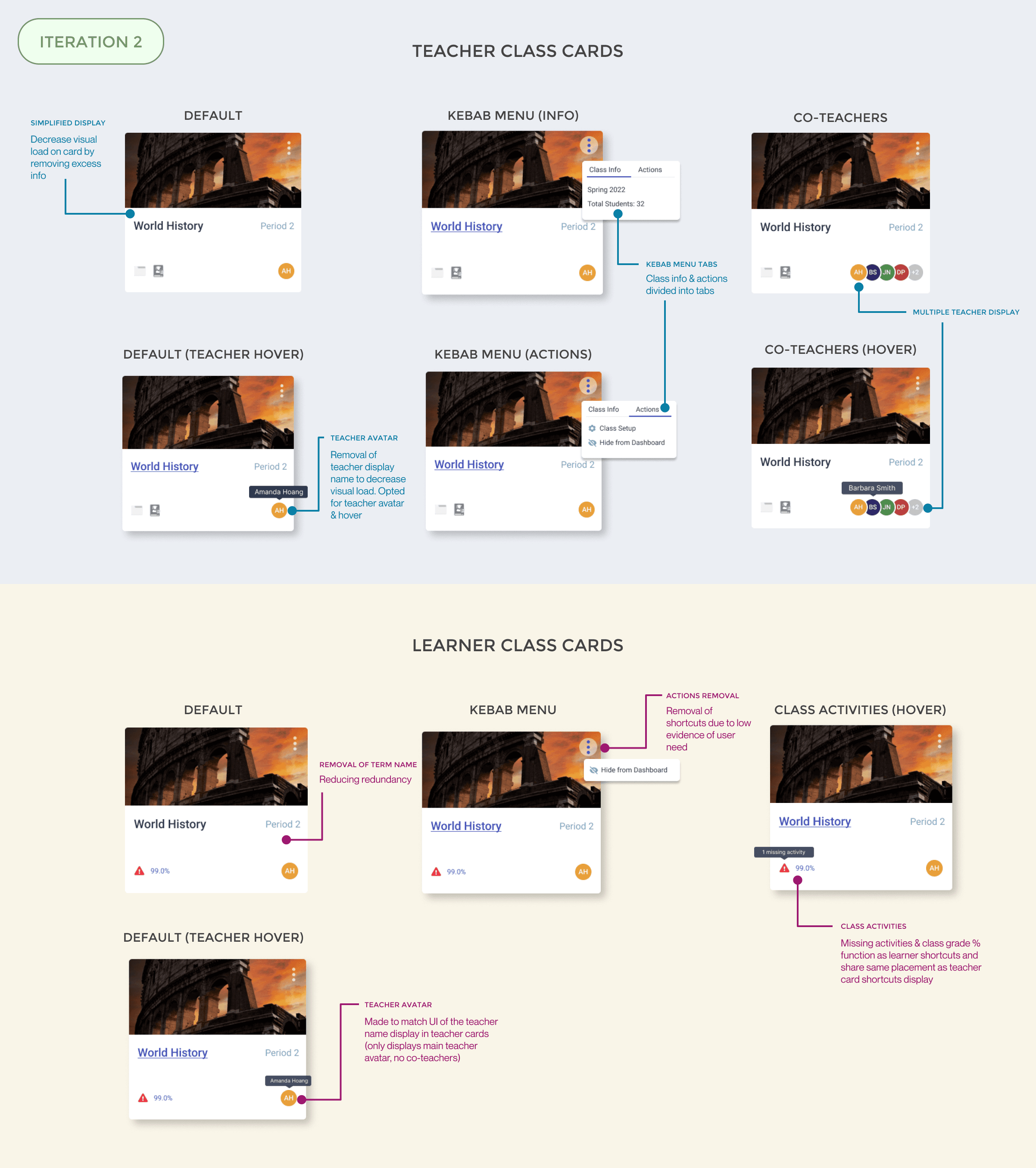 There were 4 iterations of the class card display. Their differences in addressing our card design's issues and and the addition of newer features following weekly design meetings with team leads are annotated below.