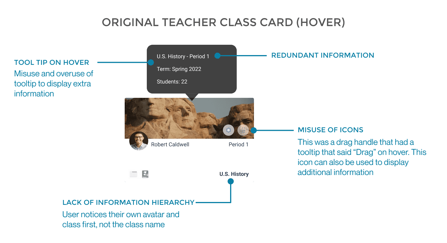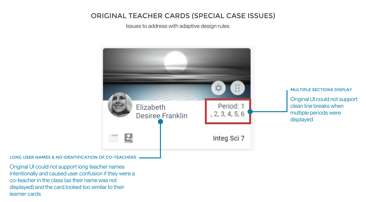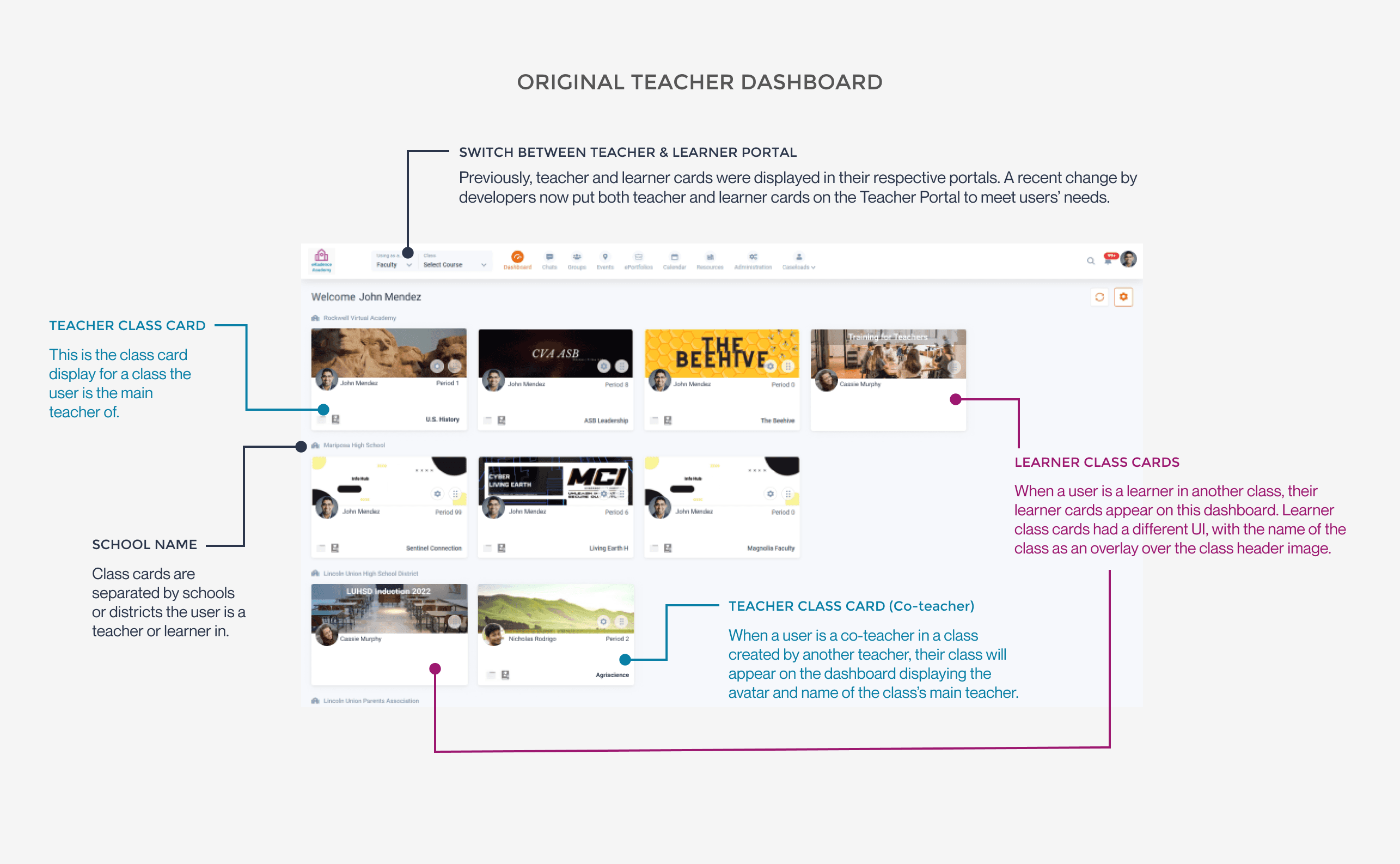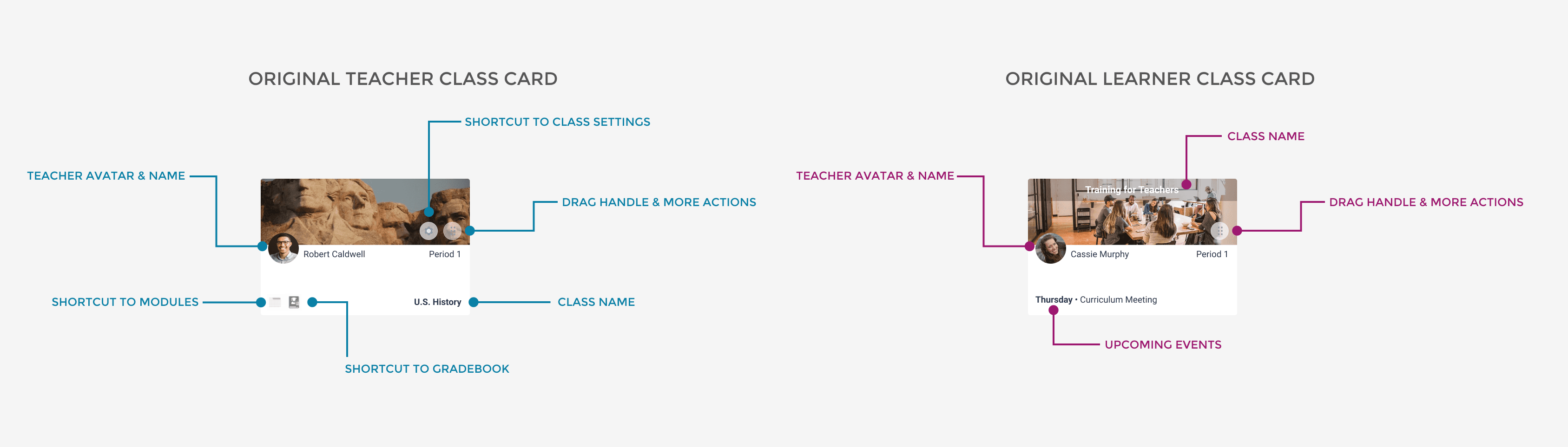 This project originated from a customer service ticket prompted by a recent development change. The modification introduced both teacher class cards (representing classes taught by the user) and learner class cards (reflecting classes they are students in or co-teach) to the teacher dashboard of our learning management system. Below is the anatomy of our original class cards and teacher dashboard.