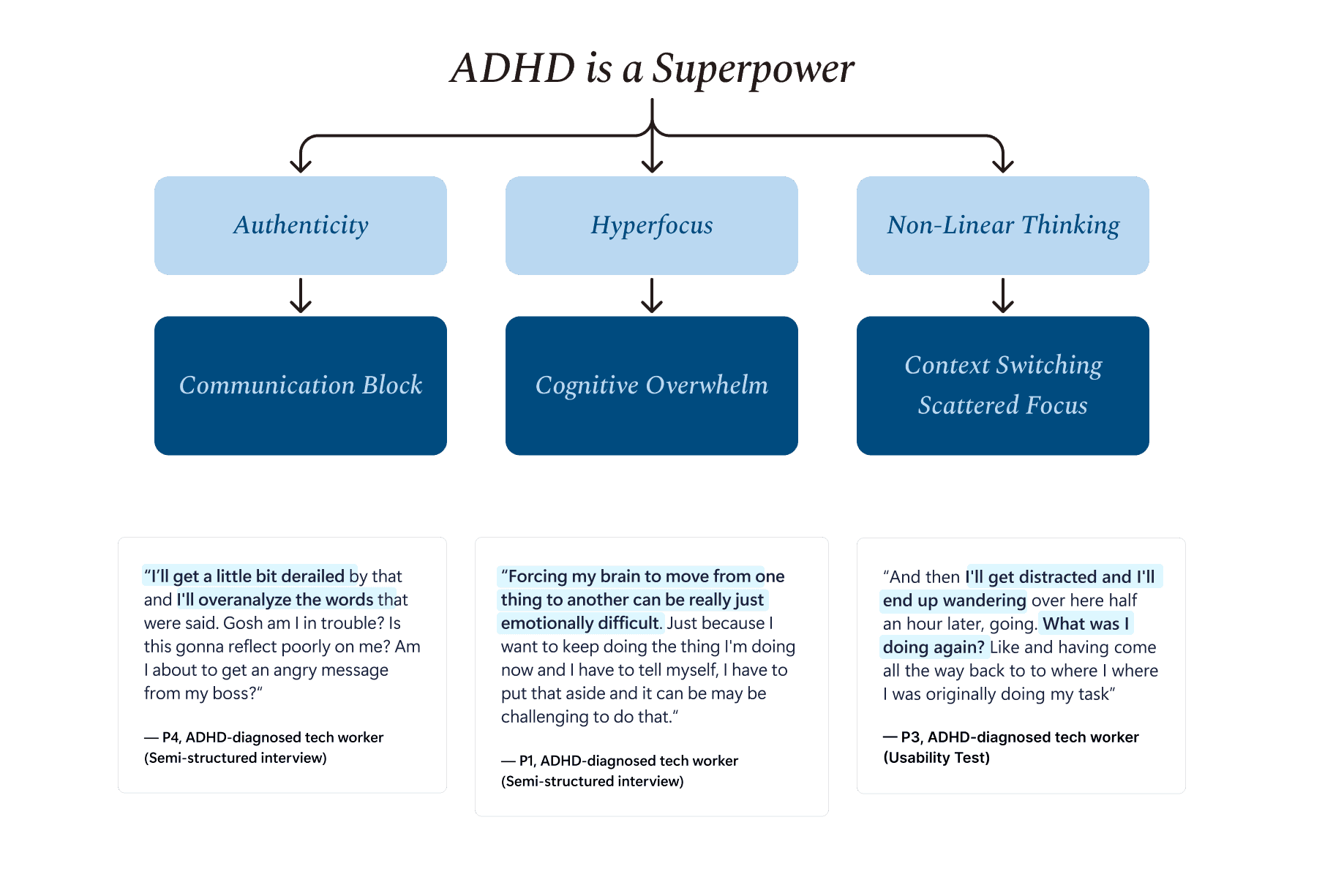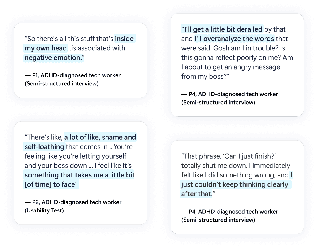In our interviews, participants described navigating moments of intense focus alongside periods of overwhelm, constantly juggling priorities and managing emotional strain. Despite the wide variation in how each individual experiences ADHD, common themes emerged: challenges around sustaining workflow momentum, protecting delicate focus, and needing flexible systems that adapt to shifting attention. Observing these patterns helped us identify design opportunities that could meaningfully support adults with ADHD in real workplace contexts.