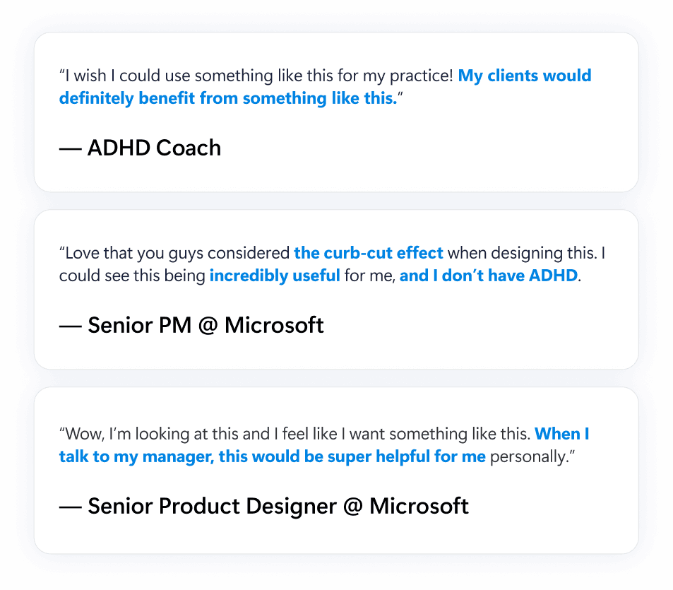 I led the end-to-end design of Flow, from conducting in-depth field and secondary research to concept exploration and prototyping. Throughout the process, I collaborated weekly with PMs, Senior UX Researchers, and Senior Product Designers at Microsoft to ensure our concept aligned with the project brief, the practices of Microsoft's Inclusion Design for Cognition, and Microsoft’s brand guidelines.