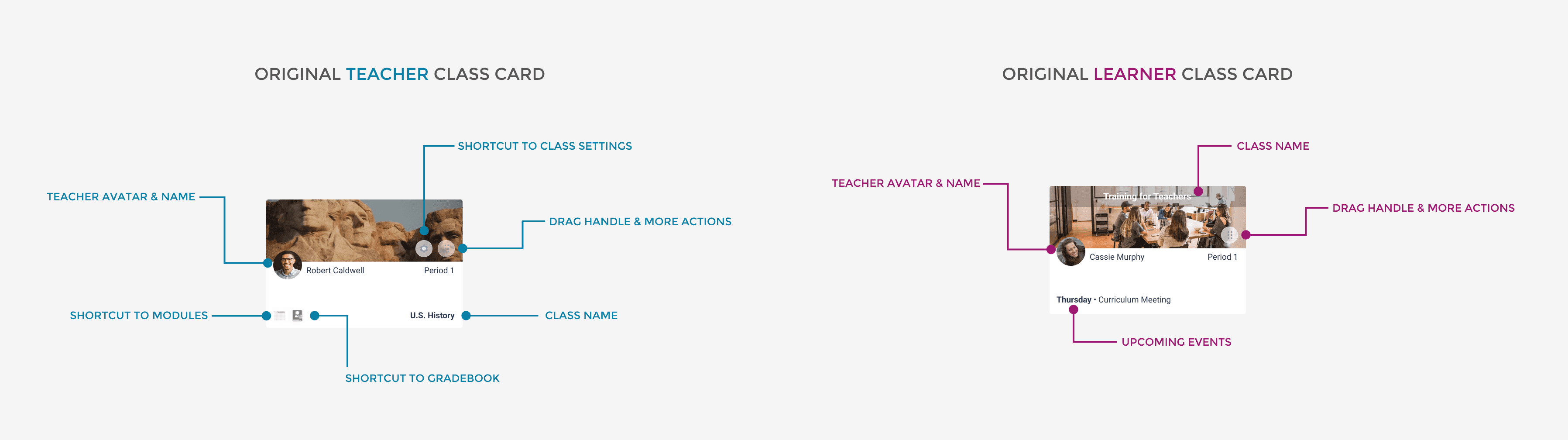 This project originated from a customer service ticket prompted by a recent development change. The modification introduced both teacher class cards (representing classes taught by the user) and learner class cards (reflecting classes they are students in or co-teach) to the teacher dashboard of our learning management system. Below is the anatomy of our original class cards and teacher dashboard.