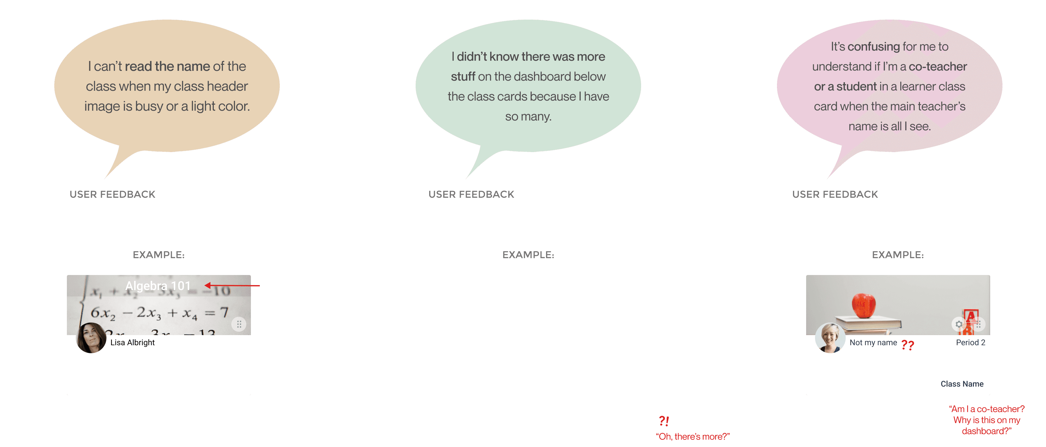 With the new merging of both teacher and learner cards on the Teacher Dashboard, users were suddenly overwhelmed with class cards when they first opened up their dashboard, especially teachers who taught in multiple schools or were learners in classes themselves. With the only visual distinction between their teacher and learner cards being that the learner cards had a gray overlay on the class header image, teachers ran into several visibility issues on these cards. After understanding users through notes from our customer service team, a few of their complaints on the new UI were as follows: